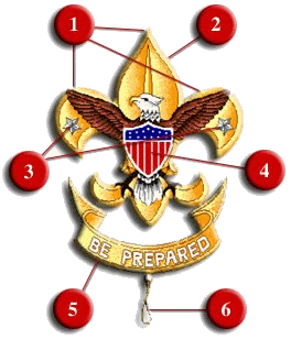 The three tips of the Fleur-de-Lis represent the three main parts of the Scout promise: duty to God, obedience to the Scout Law, and service to others. The two five-point stars stand for truth and knowledge, and the 10 points on the stars remind us of the 10 points of the Scout law. The ring holding the emblem together represents the bond of brotherhood.