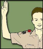 To give the Scout sign, cover the nail of the little finger of your right hand with your right thumb, then raise your right arm, bent in a 90-degree angle, and hold the three middle fingers of your hand upward. Those fingers stand for the three parts of the Scout Oath. Your thumb and little finger touch to represent the bond that unites Scouts throughout the world.
